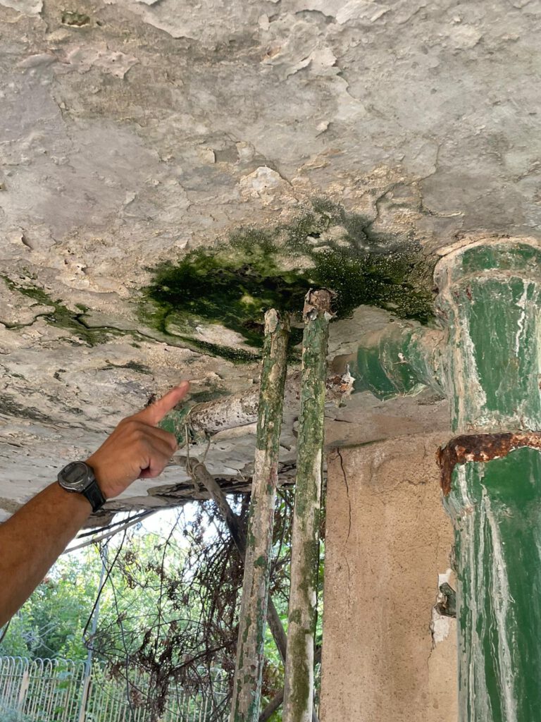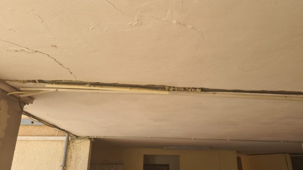 ברחוב ביאליק לאחר סיור שערכנו היום המצב עגום ביותר, התקרה בחלק התחתון של הבניין מתפוררת, הבטון חשוף לגמרי ונזקי החלודה בקורות הבניין חשופות לכל , בנוסף נראה בבירור כי נפער סדק ענק במרכז הבניין לאורך כל אורכו, סדק זה נראה היטב לעין גם ביסודות הבניין משני צידי הבניין .
