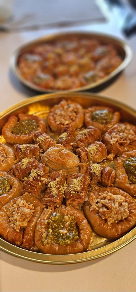 מניחים דף פילו ומשמנים היטב בעזרת מברשת סיליקון, מניחים בקצה הפילו (הקרוב אלינו לגוף)מקל וסמוך אליו פס מילוי. מגלגלים היטב בעזרת השיפוד (חשוב להשאיר 3 ס"מ בצק לא מגולגל ומקווצ'צ'ים פנימה. מניחים דף אחד בתחתית התבנית ומברישים אותו בשומן באותו אופן מניחים מעליו עוד 3 דפים אותם גם מברישים. משטחים מעל חצי מתערובת האגוזים. מעל האגוזים מניחים עוד 3 עלי פילו משומנים, שוב שמים מילוי ואז את יתרת דפי הפילו. חמאה יוצקים מעל הדף העליון ומברישים היטב. בעזרת סכין חדה חותכים את הבקלאווה לקוביות או מעוינים מעבירים לתנור ואופים 25-35 דקות, או עד שהדפים מזהיבים יפה.