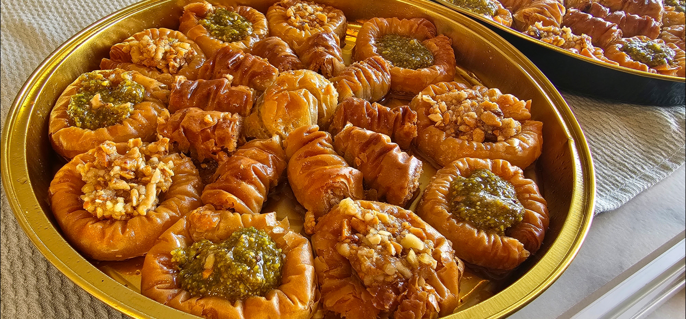 מניחים דף פילו ומשמנים היטב בעזרת מברשת סיליקון, מניחים בקצה הפילו (הקרוב אלינו לגוף)מקל וסמוך אליו פס מילוי. מגלגלים היטב בעזרת השיפוד (חשוב להשאיר 3 ס"מ בצק לא מגולגל ומקווצ'צ'ים פנימה. מניחים דף אחד בתחתית התבנית ומברישים אותו בשומן באותו אופן מניחים מעליו עוד 3 דפים אותם גם מברישים. משטחים מעל חצי מתערובת האגוזים. מעל האגוזים מניחים עוד 3 עלי פילו משומנים, שוב שמים מילוי ואז את יתרת דפי הפילו. חמאה יוצקים מעל הדף העליון ומברישים היטב. בעזרת סכין חדה חותכים את הבקלאווה לקוביות או מעוינים מעבירים לתנור ואופים 25-35 דקות, או עד שהדפים מזהיבים יפה.