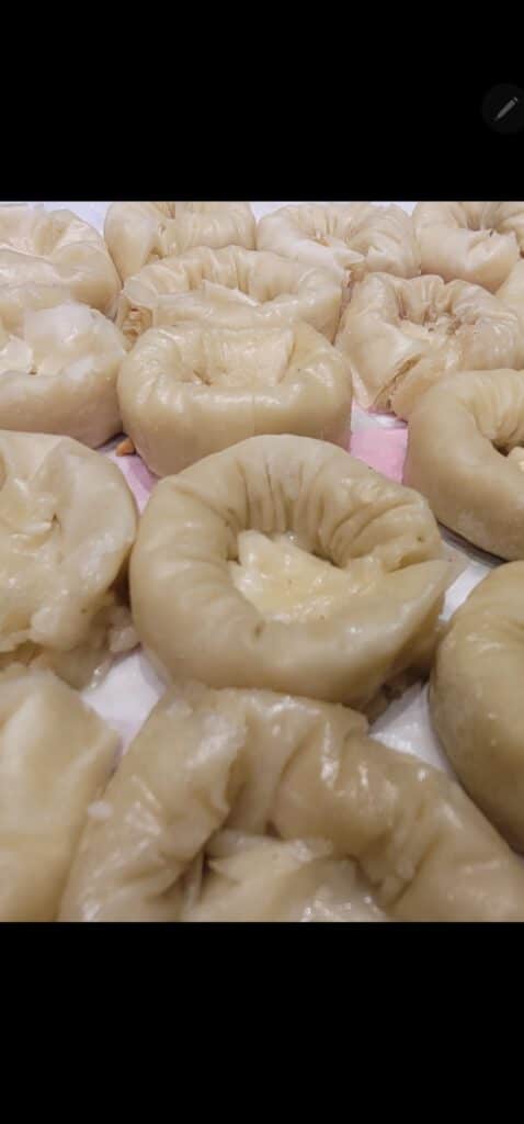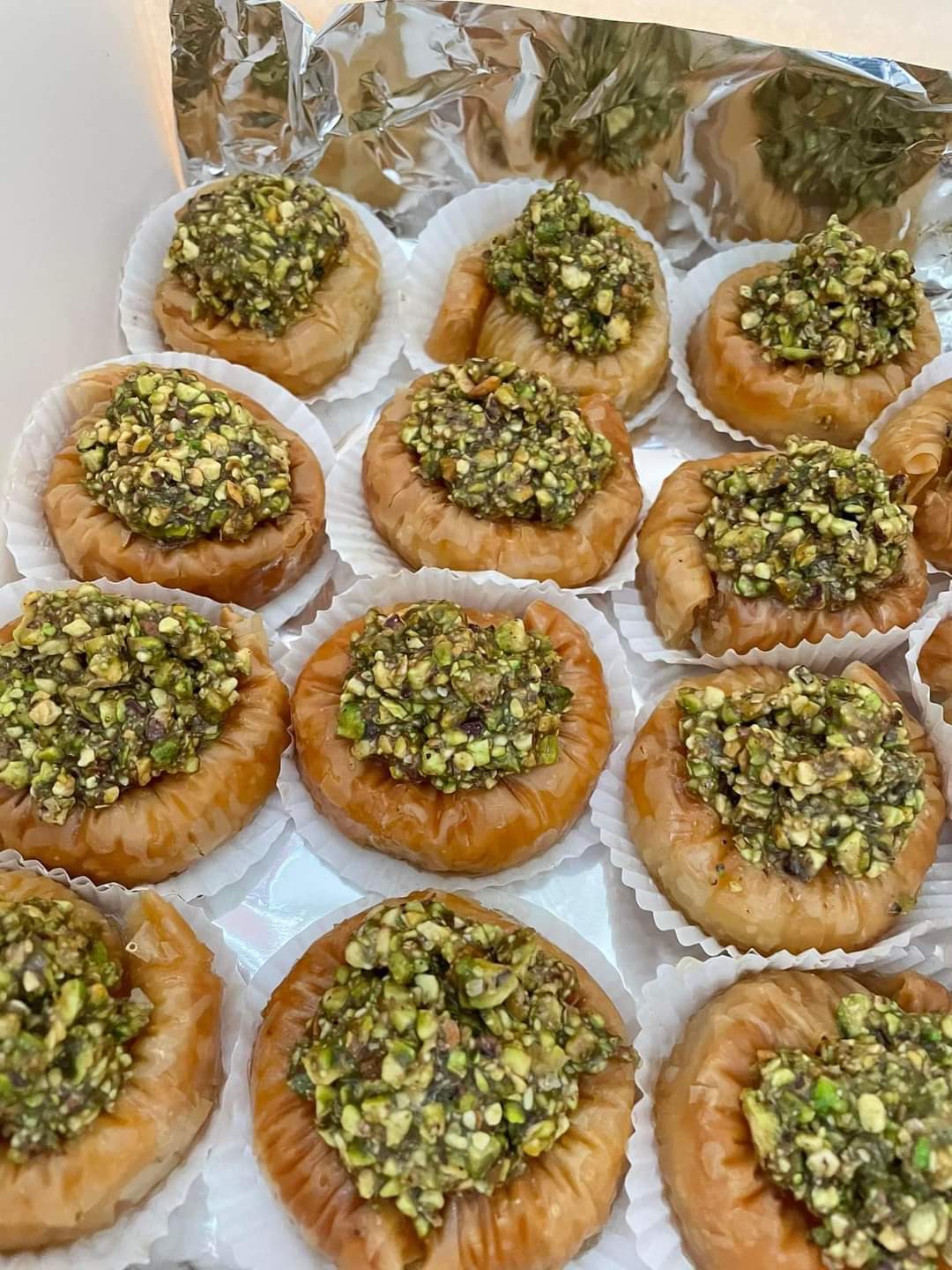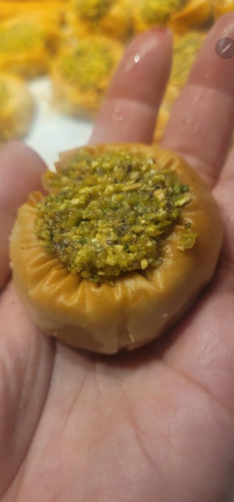 מתחילים בסירופ סוכר – מניחים בסיר ומבשלים כ-20.דקות. מניחים בצד לצינון מלא. בקערה מערבבים 100 גר׳ פיסטוק טחון (משאירים קצת בצד בשביל הקישוט לאחר האפייה) עם אגוזי מלך סוכר חום. על משטח נח לעבודה פורסים עלה פילו, מחלקים ל-4. ומברישים בחמאה מומסת. מניחים מעט מלית בקצה הדף הקטן ומגלגלים בעזרת שיפוד כשהחלק הצר כלפינו כמעט עד הסוף. ומקפלים לצורך עיגול. כך מכינים מכל הבצק. משמנים את כל האמבטיות הקטנות שנוצרו. מערבבים את המלית ומניחים בגומה. אופים ב-170.מעלות עד הזהבה. כשהגומות יוצאות שופכים עליהן כשהן חמות סירופ סוכר.