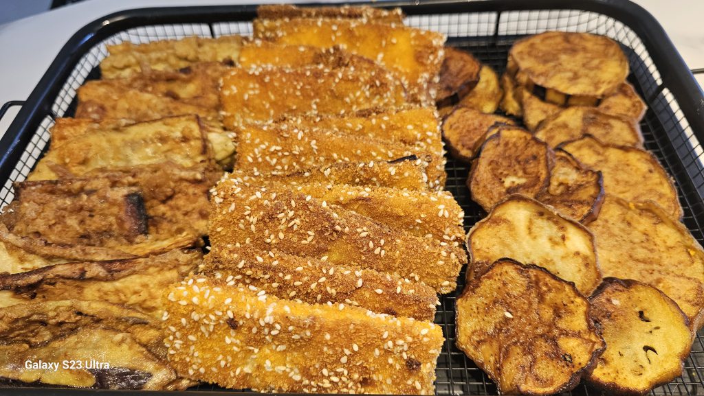 - פסים של חציל בציפוי שניצל – קולפת לגמרי, ואז מעבירה לקמח ביצה ופירורי לחם.