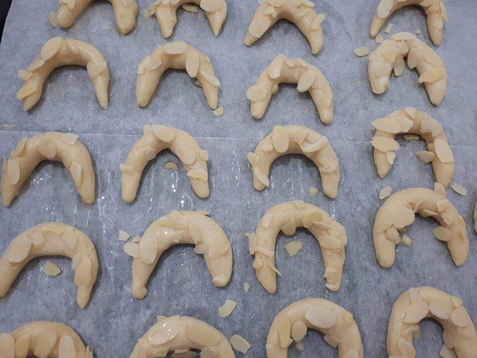 יוצרים כדורים קטנים מהבצק ומעצבים כל אחד מהם לצורת סהר. מורחים מעל חלבון ביצה ומפזרים שקשים פרוסים. מניחים על גבי תבנית תנור מרופדת בנייר אפייה במרווחים. אופים במשך כ-12-15 דקות או עד שהעוגיות מזהיבות אך עדיין בהירות מאוד. מצננים לחלוטין, מפדרים באבקת סוכר.