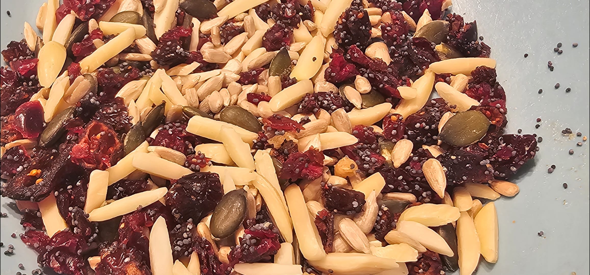 אני שמתי כך: חמוציות, גפרורי שקדים, פיסטוק גרוס, גרעיני חמנייה ודלעת ולפוזה הוספתי כף פרג.