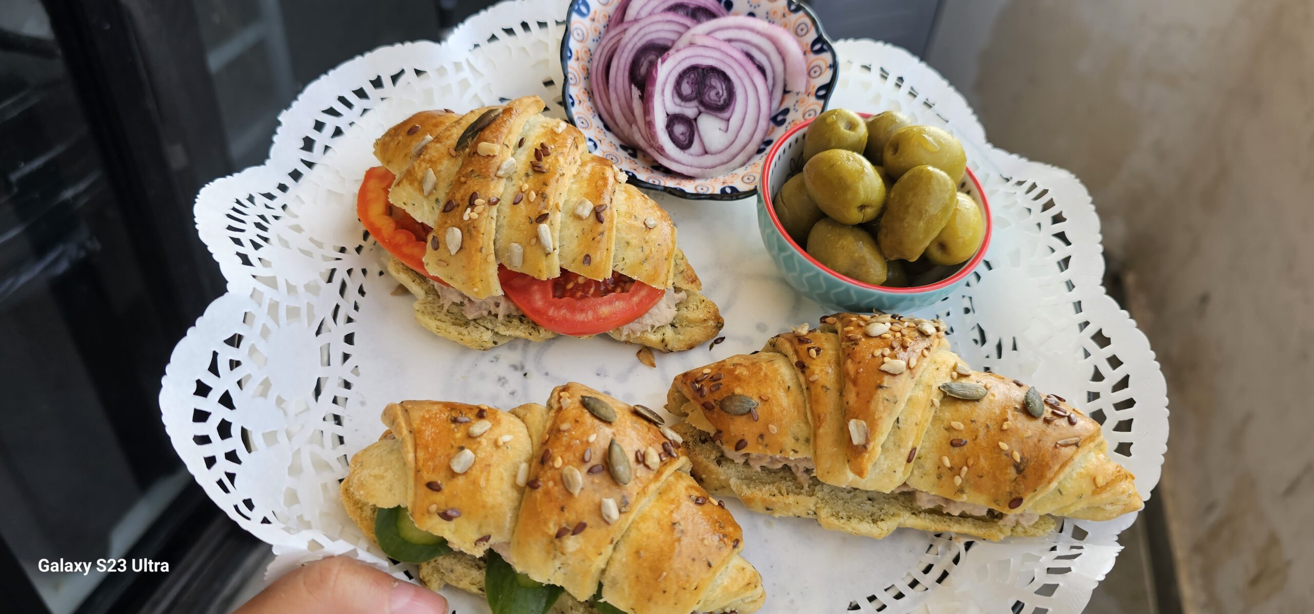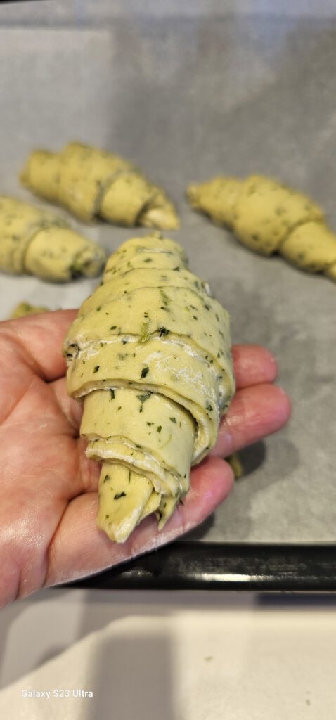 אני מכינה בצק שמרים רך וטוב כאשר הפסטו בתוך הבצק. מתפיחה התפחה ראשונה, יוצרת עיגולים בגודל תפוז ומרדדת דק. מורחת כמות נדיבה של שומן וחותכת למשולשים. מגלגלת לצורת קרואסונים ומתפיחה שוב במגש. מורחת בביצה, מוסיפה תוספות ואופה 180 מעלות.