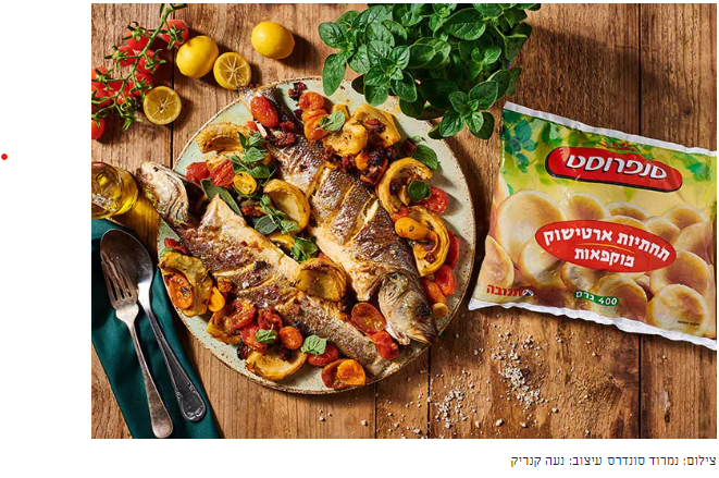 - 05.מפזרים סביב הדגים את תערובת הארטישוק והעגבניות.