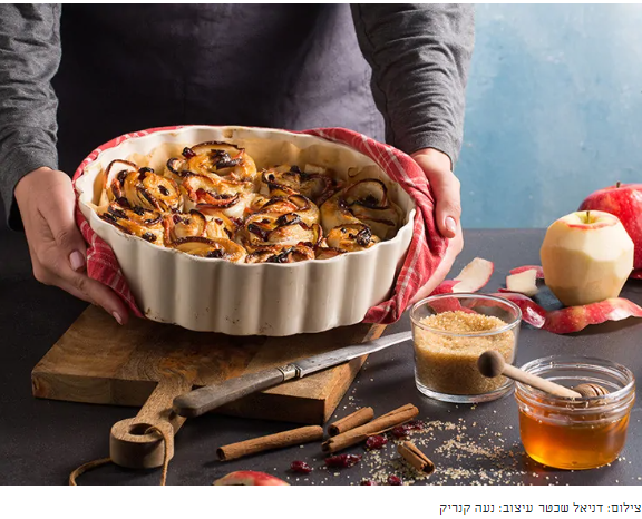 - 04.מורחים כל רצועה גבינת נפוליאון ומעל מסדרים בשורה את פרוסות התפוחים באופן צמוד ומגלגלים כך שתתקבל צורה של שושנה. חוזרים על הפעולה עם יתרת הבצק.
