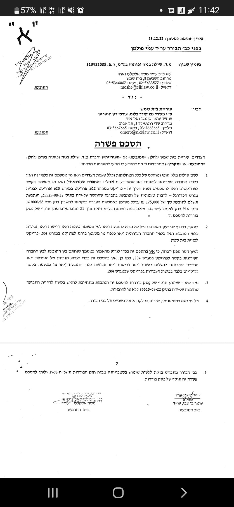 לאחרונה, חברת הבנייה הגישה תביעת נגד התביעה של העירייה, מכיוון שהאיחור לא בוצע מיוזמתם, אלא כי העירייה לכאורה לא שילמה את הכסף לחברה הבנייה בזמן ולכן הפרויקטים התעכבו. אחרי דין ודברים, העירייה וחברת הבנייה הגיעו להסכם פשרה שבו הוחלט כי העירייה תשלם לחברת הבנייה 175 אלף שקל. כמובן שהתביעה הקודמת נמחקה.