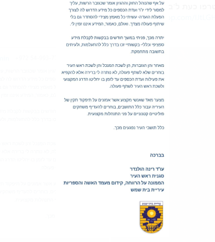 רינה והגזבר בסכסוך? סגנית ראשת העירייה, רינה הולנדר שלחה השבוע מכתב לגזבר העירייה, אריה ברדוגו ובו הסבירה כי היא מתכננת להקפיא את פעילותה של וועדת הכספים, אותה היא מנהלת. לטענתה, לשכת ראשת העירייה, המנכ"ל והגזברות לא משתפים פעולה עימה ולא מוסרים לה את המידע הדרוש להפעלת הוועדה.