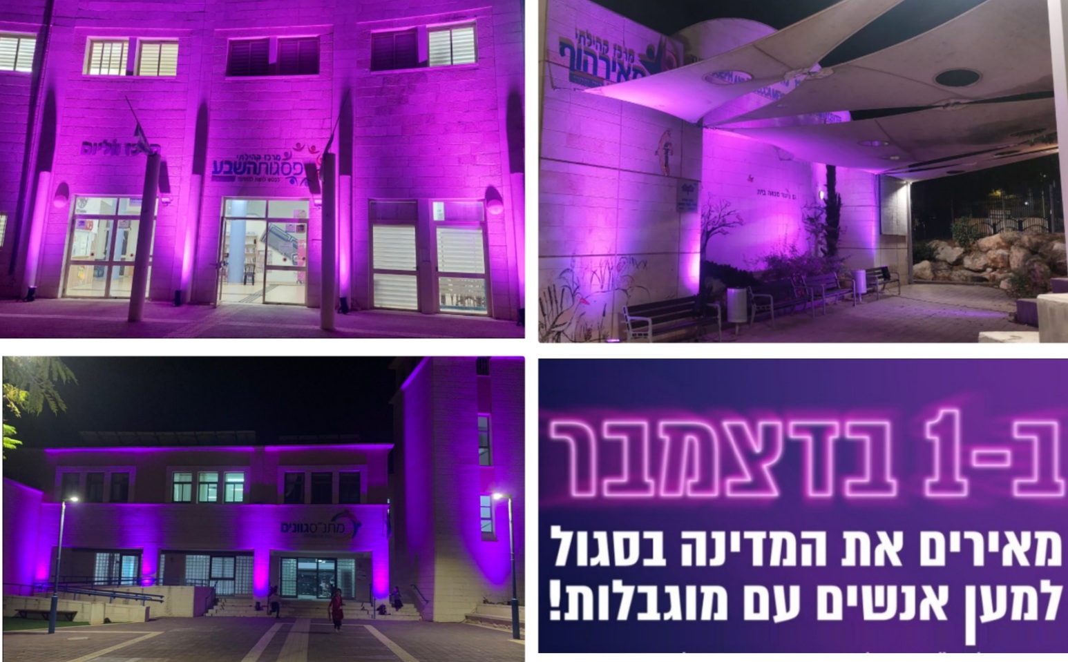המרכזים הקהילתיים נצבעו בסגול: לאחרונה צוין היום הבינלאומי לזכויות אנשים עם מוגבלות. יום זה הוקדש לקידום ההבנה כלפי אנשים עם מוגבלות ולעידוד התמיכה בכבודם, בזכויותיהם ובשלומם. כמו כן, היום נועד גם להגביר את המודעות לתועלת שבהכללת אנשים עם מוגבלות בכל היבטי החיים הפוליטיים, החברתיים, הכלכליים והתרבותיים.