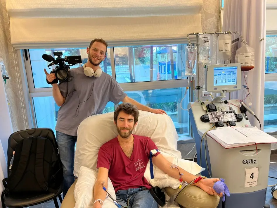 בשבוע שעבר הגיע אביב לבית אורנית של עזר מציון בפתח תקווה על מנת לבצע את תהליך התרומה. התלווה אליו אור בר אילן, חבר קרוב שלו, שהתרגש במיוחד. אור עבר בעצמו השתלת מח עצם מתרומה שקיבל מאחותו לפני ארבע שנים. הוא הגיע עם מצלמת וידיאו ותיעד את התהליך עבור סרט שיכין על החוויה המשותפת שלהם משני צדדיה.