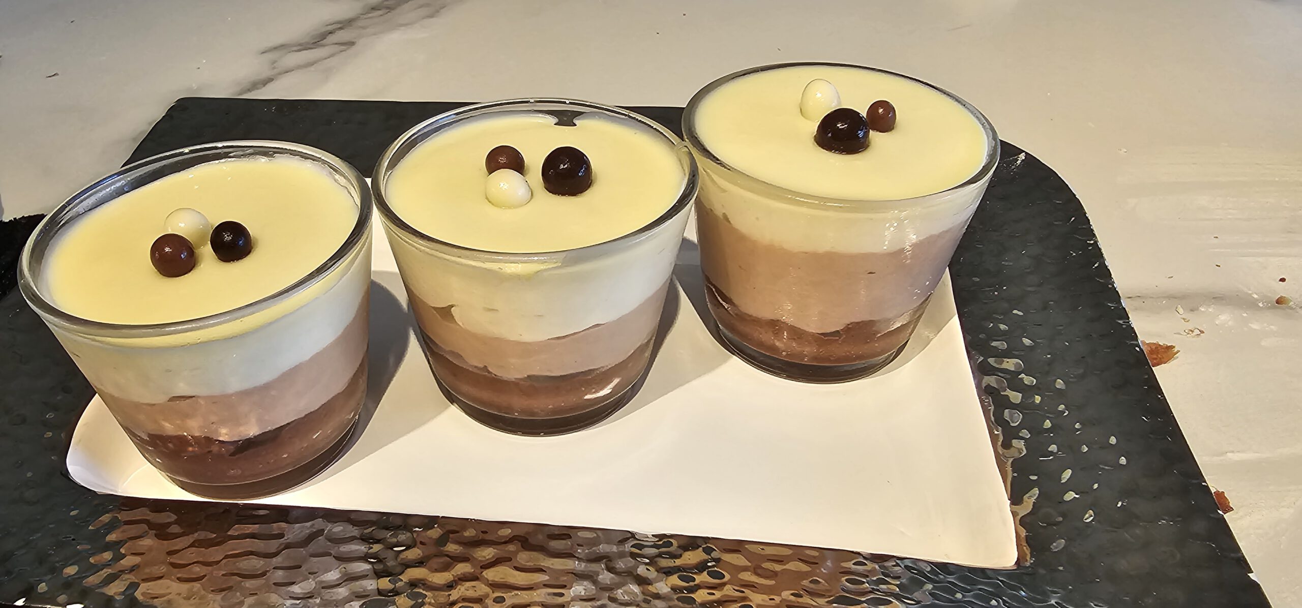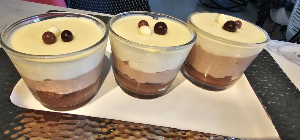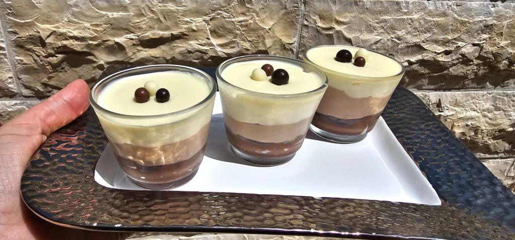 קוצצים את 3 סוגי השוקולד ושמים ב-3 קערות נפרדות. מוסיפים חמאה לכל קערה, שמנת לכל סוג שוקולד וממסים יחד במיקרוגל. מערבבים היטב עד שמתקבלת תערובת. בקערת מיקסר מקציפים את השמנת הקרה לקצפת יציבה אך רכה (מרקם יוגורט). מקפלים כ-1/3 מכמות הקצפת לתוך כל שוקולד מומס עד קבלת מוס אחיד ומעט דליל. יוצקים את מוס השוקולד המריר לתוך הכוסות וממלאים עד כ-1/3 מגובהן. מקפיאים למשך כ-10 דקות. יוצקים את מוס השוקולד החלב וממלאים עד 2/3 מגובה הכוס. מקפיאים למשך 10 דקות. יוצקים את מוס השוקולד הלבן וממלאים עד שפת הכוס. מקפיאים למשך 10 דקות להתייצבות.